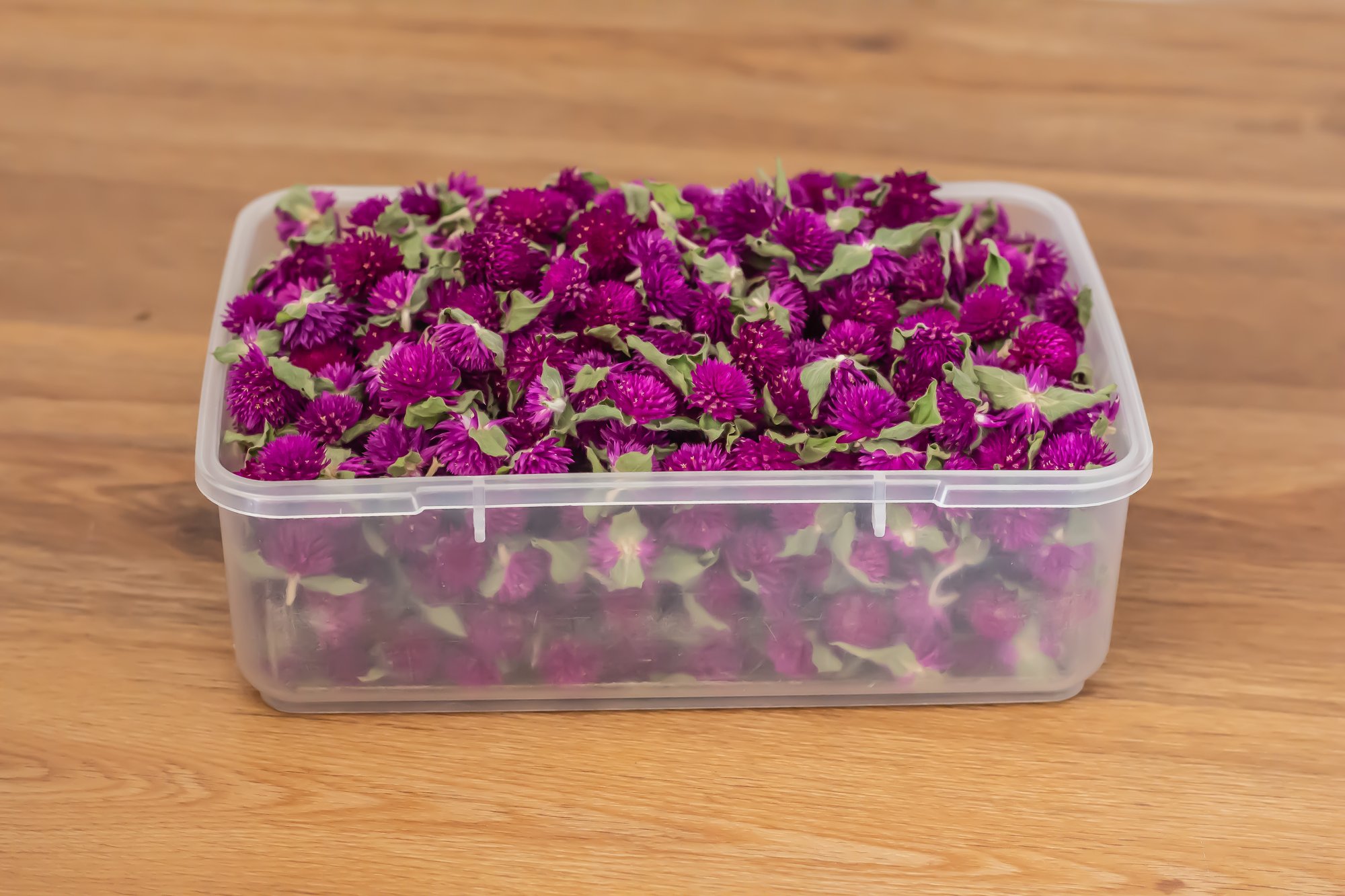 A bundle of Globe Amaranth flower heads (also know as Gomphrena) in darker purple as pictured. You will receive 100 grams (pictured in last photo) The heads are 1cm - 1.5cm in size. You will receive 100 grams.