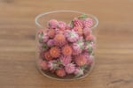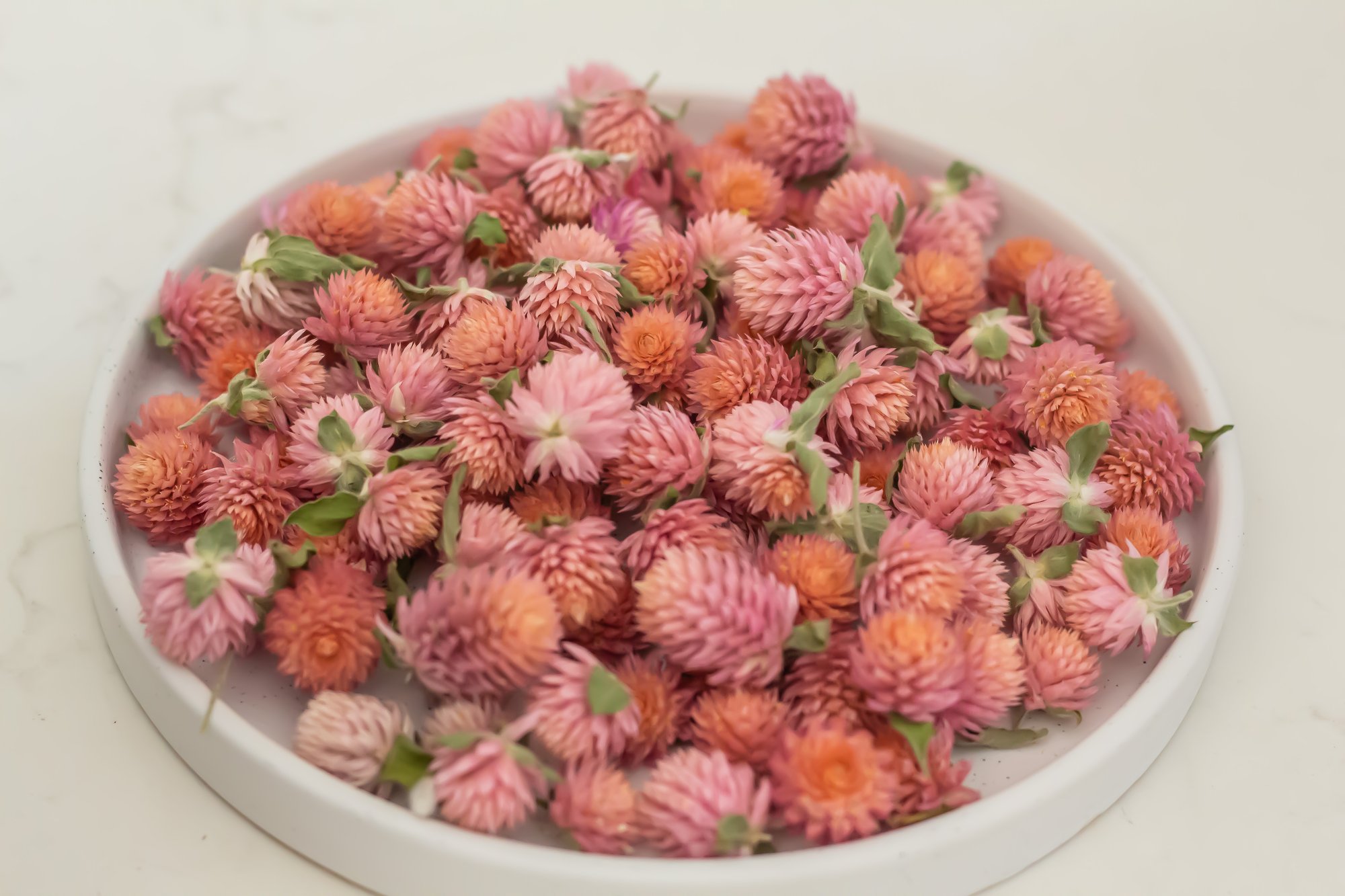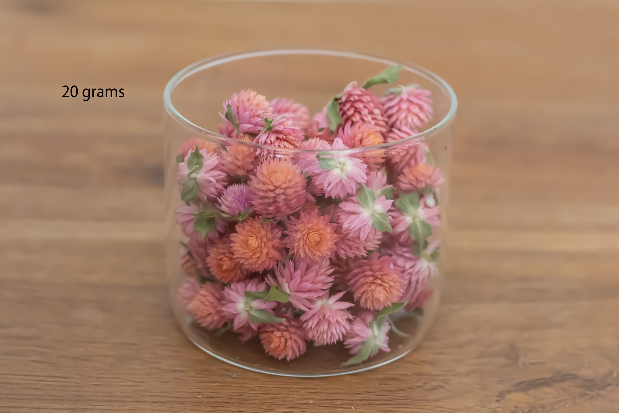A bundle of Globe Amaranth flower heads (also know as Gomphrena) in a soft peach pink as pictured. You will receive 20 grams (approx. 100 flower heads) The heads are 1cm - 1.5cm in size. You will receive 20 grams.