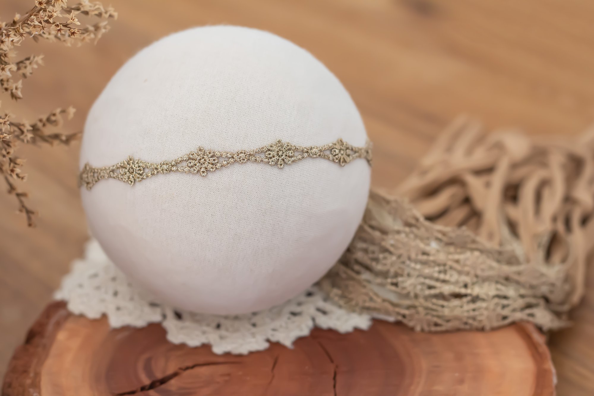 A dainty gold lace tieback with stretch ties on the ends.