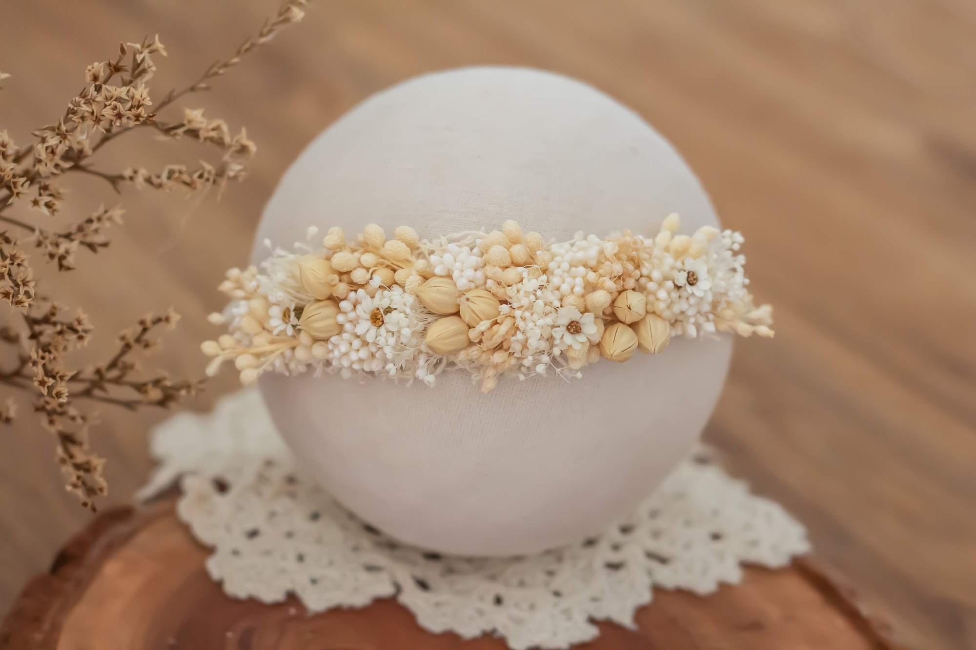 A stretch tieback half halo made to fit newborn.