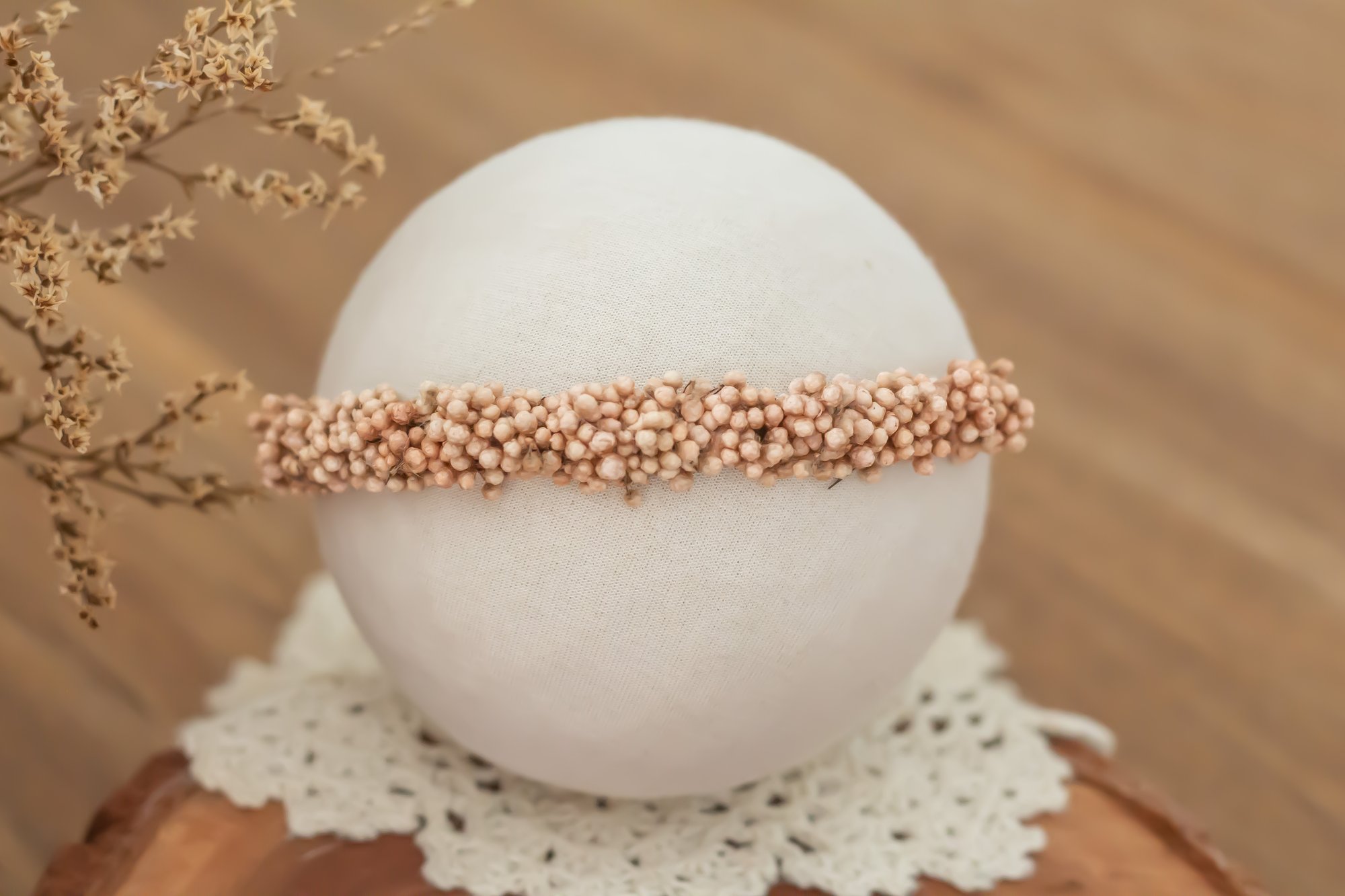 A stretch tieback halo made to fit newborn.