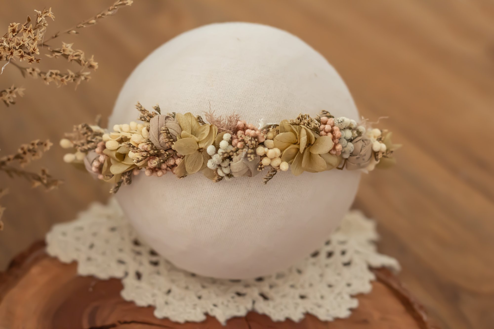 A stretch tieback halo made to fit newborn to sitter.