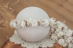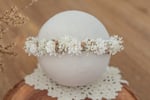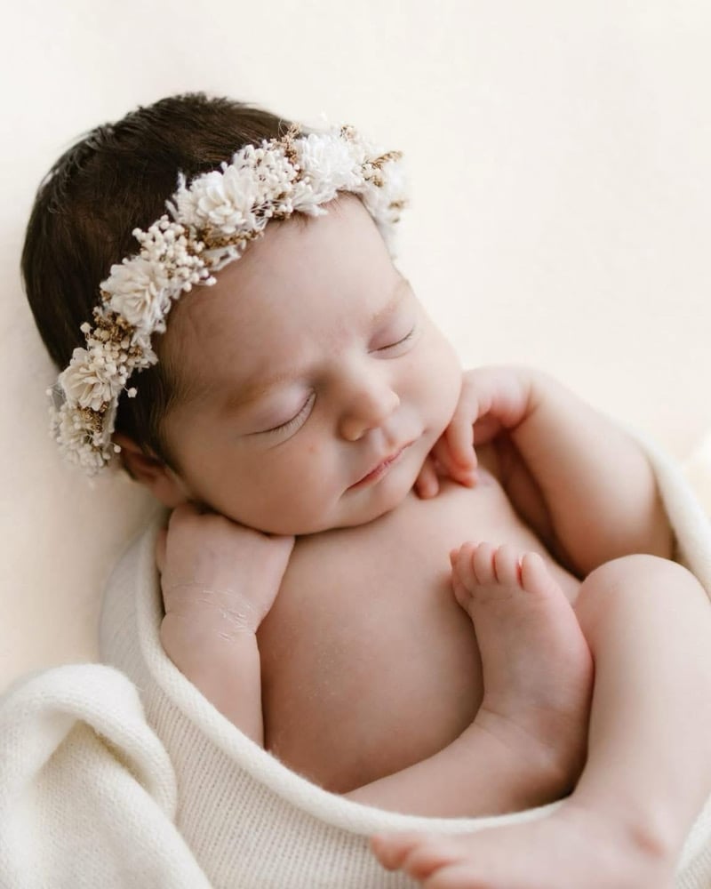A stretch tieback halo made to fit newborn to sitter.