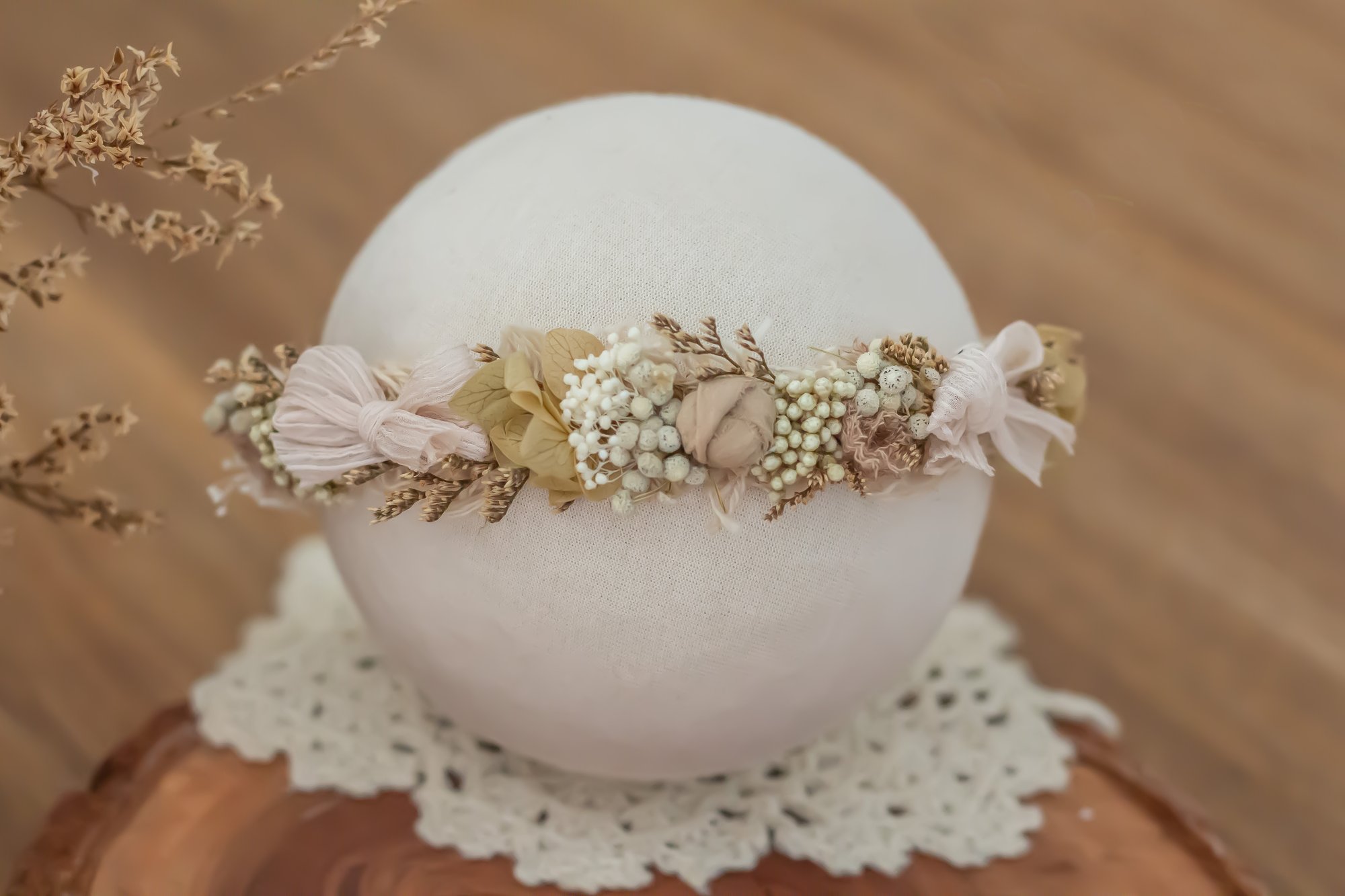 A stretch tieback halo made to fit newborn to sitter.