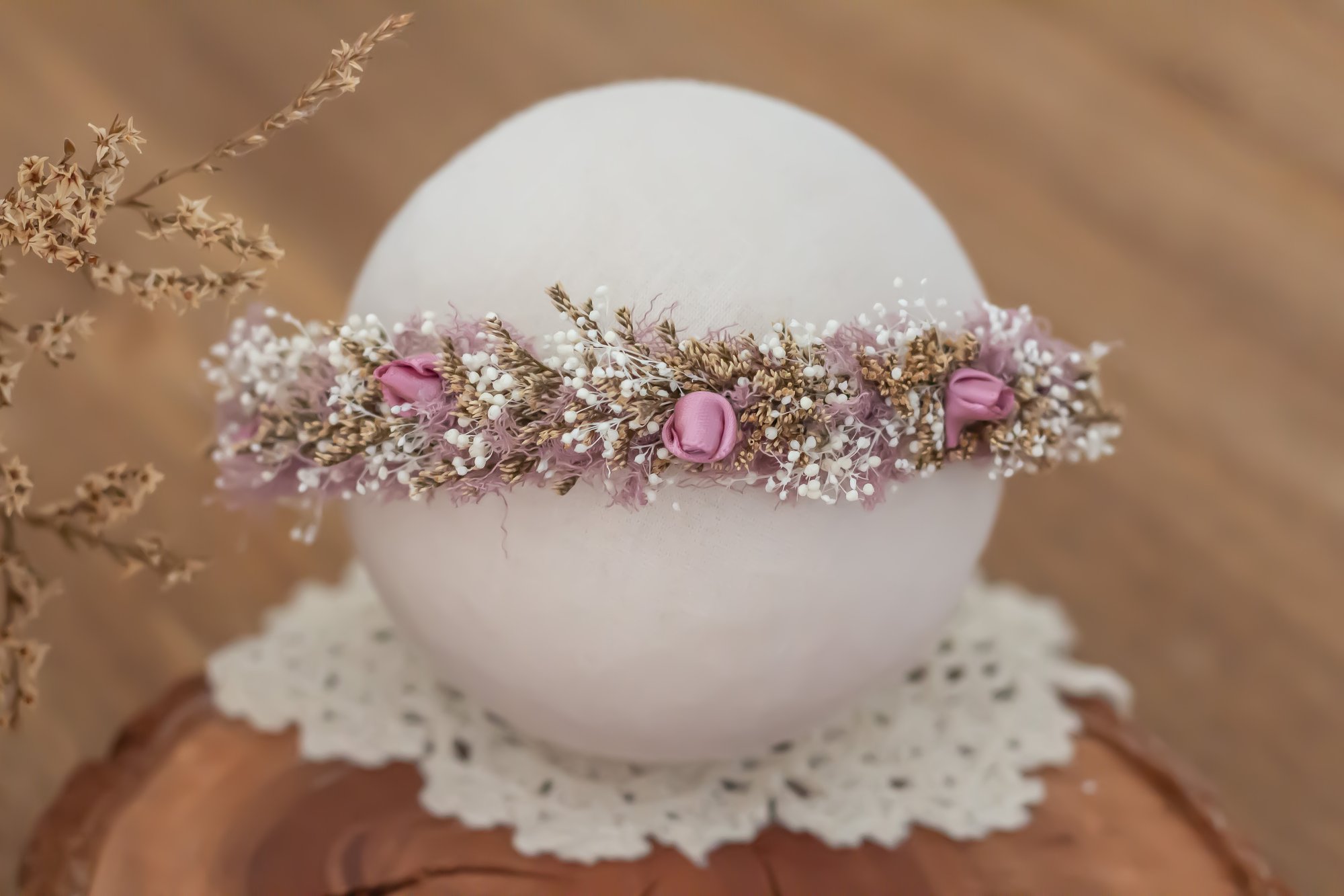 A stretch tieback halo made to fit newborn to sitter.