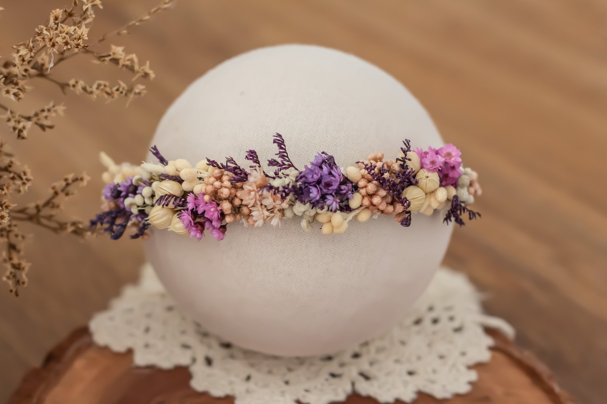 A stretch tieback halo made to fit newborn to sitter.