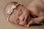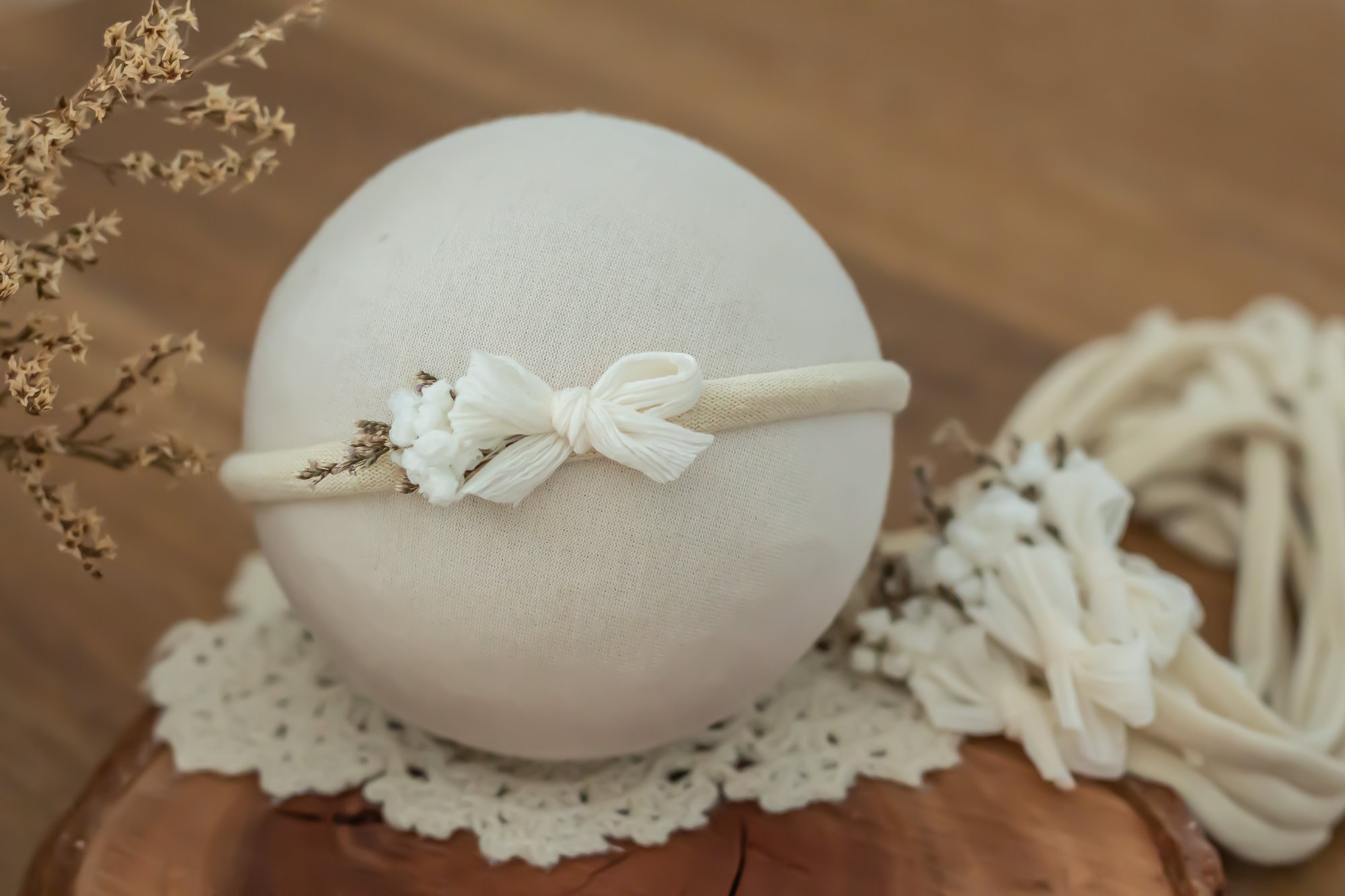 An Ivory stretch tieback featuring flowers & a hand tied bow.