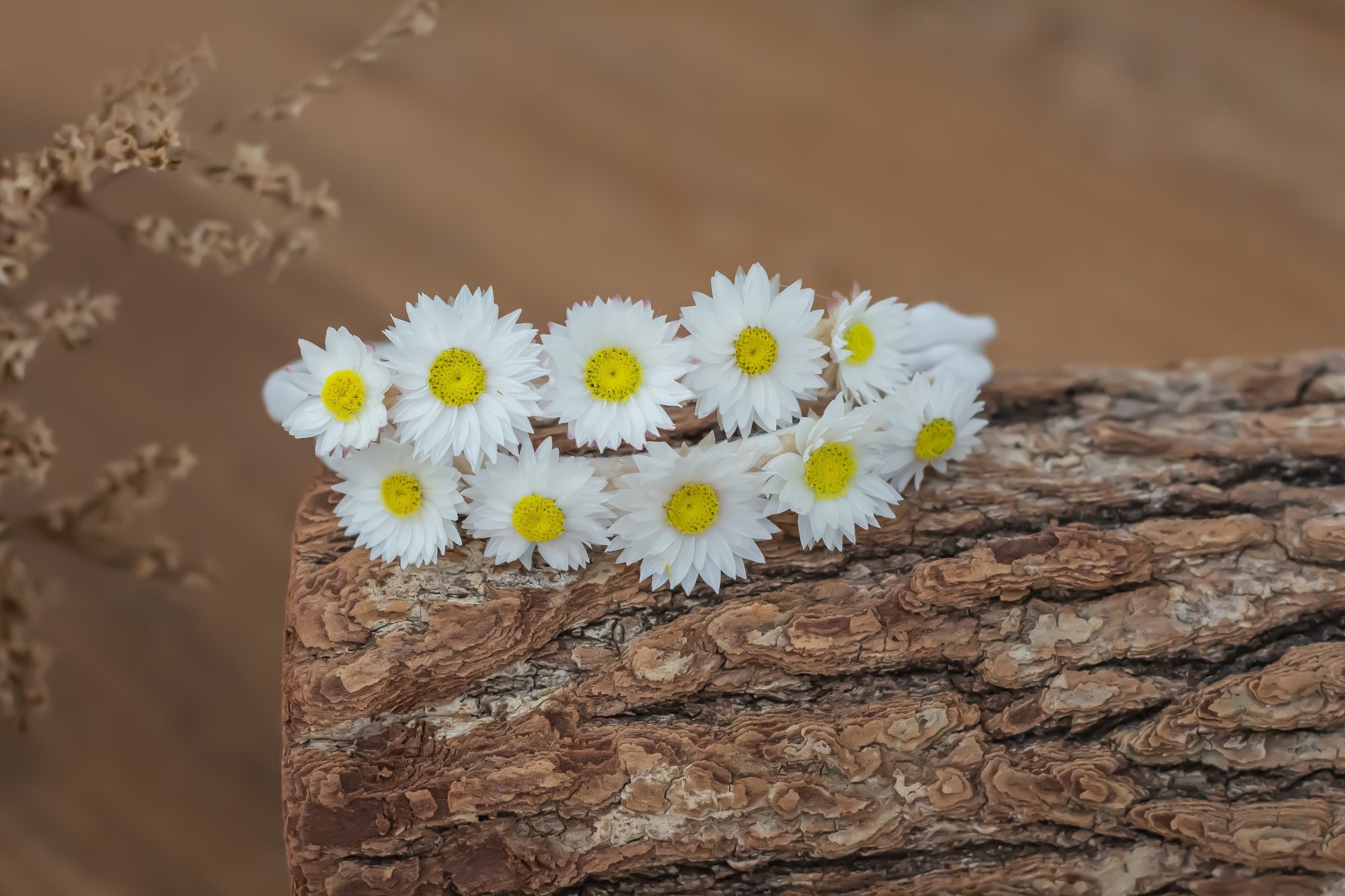 A white stretch tieback featuring dried flowers.