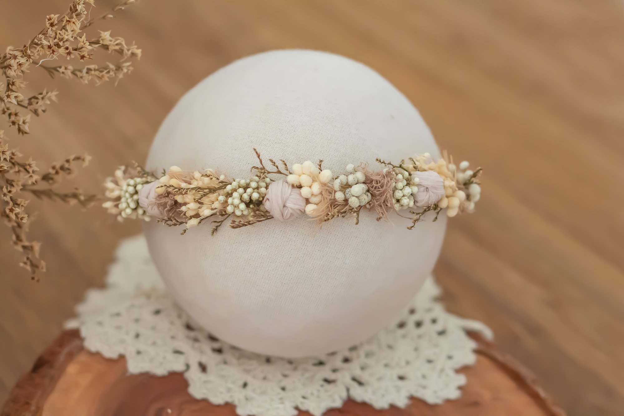 A slightly thinner stretch tieback halo made to fit newborn.