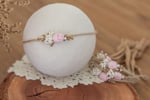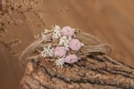 A dainty, twine tieback featuring a dusty pink rosette & flowers.